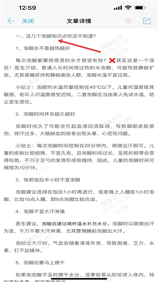 4、文章知識點頁詳細講解泡腳水溫、時間等知識點,糾正養生誤區,提供科學泡腳建議,幫助用戶全面提升健康管理能力。