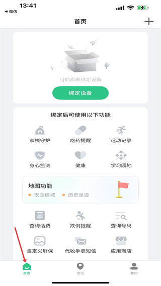 1、首頁,顯示未綁定設備,綁定后可用家校守護、吃藥提醒等多項功能,助力管理智能設備相關服務。