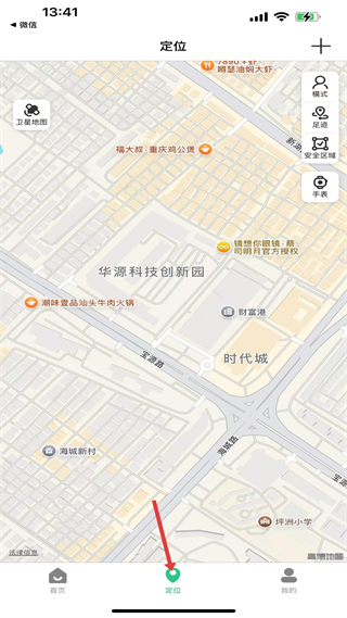 3、定位頁,呈現地圖界面,具備衛星地圖、足跡、安全區域等功能,便于定位和管理設備位置。