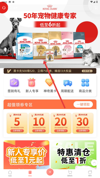 2、進入寵物用品相關界面,能看到50年寵物健康專家等宣傳,還有各類寵物食品展示,以及簽到有禮、新人專享等活動。
