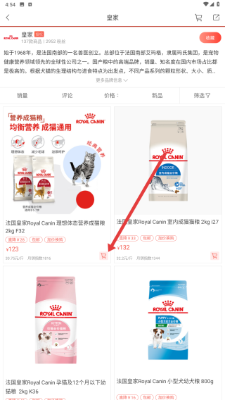 3、寵物食品品牌頁面,可瀏覽不同種類的寵物食品,如成貓糧、幼犬糧等,查看價格等信息,選擇心儀的商品。