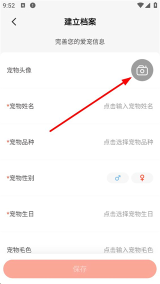 2、建立檔案時需填寫寵物姓名、品種等必填信息,還可上傳頭像、補充毛色,填寫完畢點擊保存即可完成檔案建立。