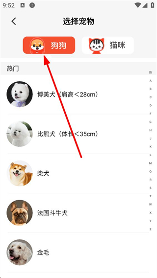 3、選擇寵物品類時,先選定狗狗或貓咪分類,再從熱門列表中選擇對應品種,快速完成品種信息的填寫。