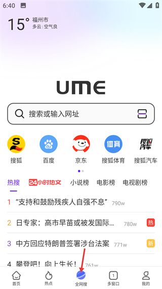 1、UME瀏覽器首頁,顯示本地天氣,提供搜索欄及常用網站入口,可查看熱搜榜單,是獲取資訊與訪問網絡的核心入口。