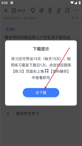 4、若需下載練習資料在出現下載提示時點擊去下載,即可將練習資料導出,還可在練習頁面右上角資料緩存中查看已下載的資料。