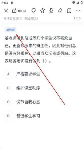 3、在專項智能練習中認真閱讀單選題題干和選項,分析姜老師的行為,結合知識點選擇正確答案,提升對職業理念知識點的掌握程度。