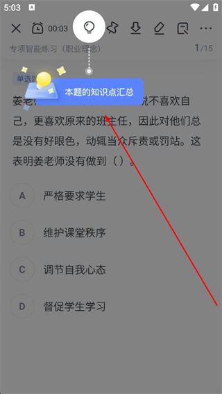 2、進入職業理念專項智能練習后,遇到題目可點擊上方燈泡圖標,查看本題的知識點匯總,幫助理解題目涉及的知識點。