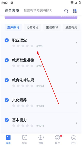 1、打開APP在首頁選擇綜合素質科目,進入題庫練習頁面,可看到職業理念、教點擊職業理念即可進入該知識點的練習環節。