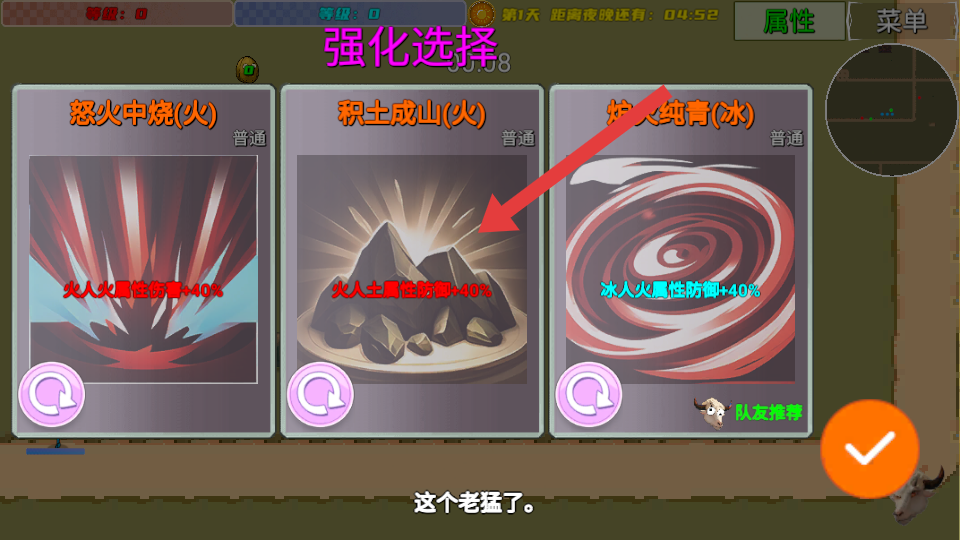 2、進入強化選擇界面,有怒火中燒等強化項,可根據需求選,比如選積土成山提升防御,選好后確認。