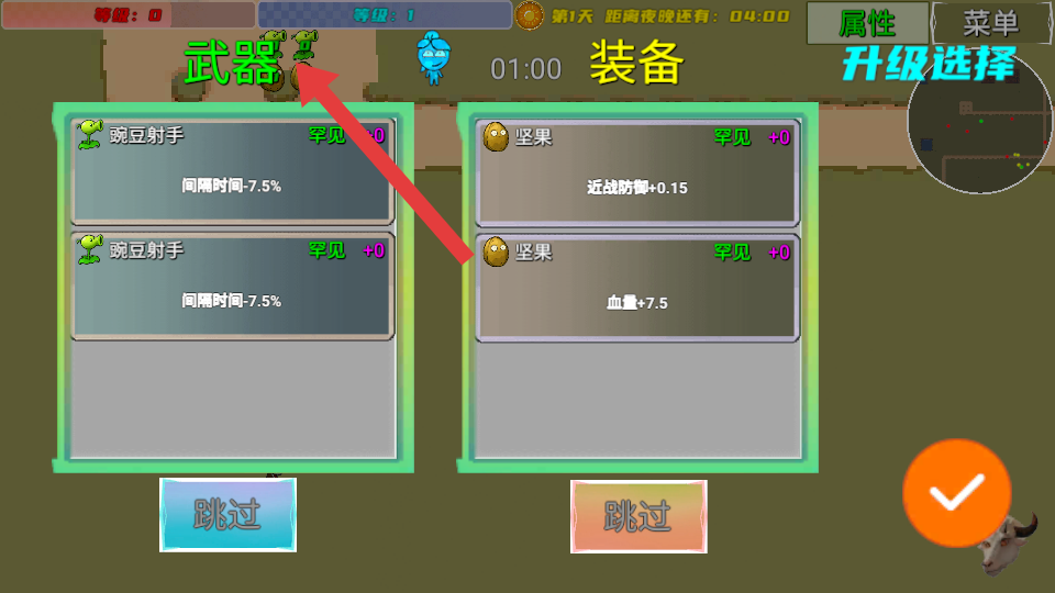 4、升級時進入升級選擇界面,有武器和裝備選項,武器可選豌豆射手,裝備可選堅果,選好后確認升級。
