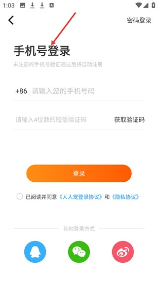 1、登錄界面,支持手機號、密碼及QQ、微信、微博登錄,未注冊手機號驗證后自動注冊,需同意登錄和隱私協議。