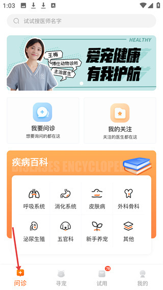 2、在問診頁,選我要問診或我的關注,聯系寵物醫生,借疾病百科,了解養寵健康知識。
