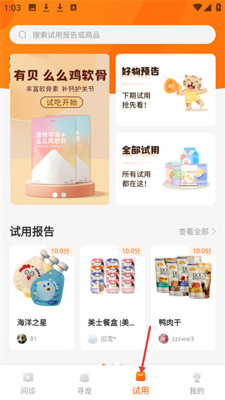 4、試用界面可搜索試用報告或商品,有寵物零食試用活動及試用報告展示,方便寵物主人了解和試用寵物好物。