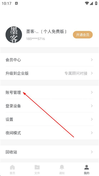 1、進入墨客APP我的頁面,找到賬號管理選項,點擊進入賬號管理頁面,可查看頭像、昵稱等賬號信息。