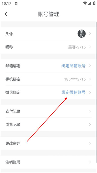 2、在賬號管理頁面找到微信綁定選項點擊綁定微信賬號,可進行微信賬號綁定操作,完善賬號綁定信息。