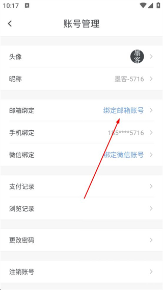 3、繼續在賬號管理頁面找到郵箱綁定選項點擊綁定郵箱賬號,進入綁定郵箱賬號頁面。