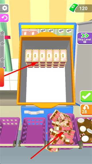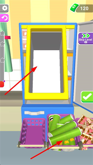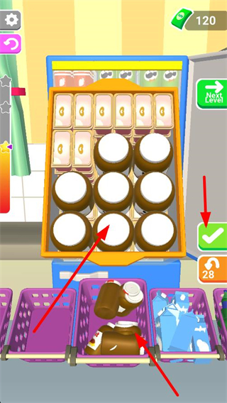 4、處理儲物籃里的罐裝物品,把這些罐子放到貨架剩余的空位里,全部整理好后界面會出現NextLevel按鈕,點擊可進入下一關。