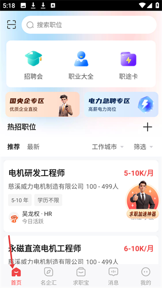1、首頁,有搜索職位功能,還有招聘會等板塊,展示國央企、電力急聘專區及熱招職位,方便用戶查找招聘信息。