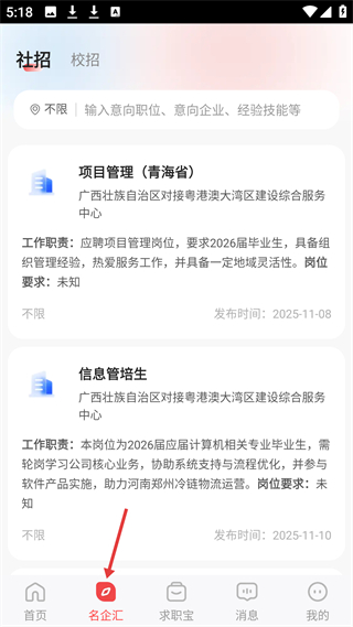 2、名企匯界面,分社招和校招,可搜索意向職位,查看項目管理等崗位職責和發布時間,助力了解名企招聘需求。