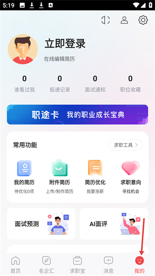 4、我的界面,可登錄編輯簡歷,查看投遞記錄等,還有簡歷優化等功能,是求職信息和流程管理中心。