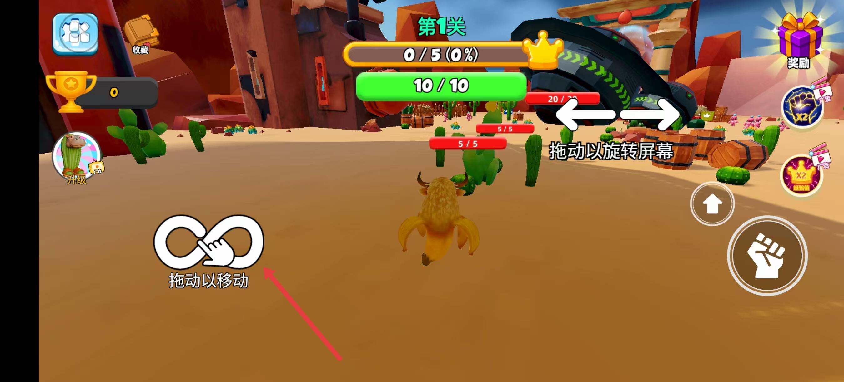 1、進入佳作后,看到有清晰的操作提示,按照拖動以移動的指引,用手指在屏幕上進行拖動操作,操控角色在有著仙人掌、各類建筑的場景里自由行動。