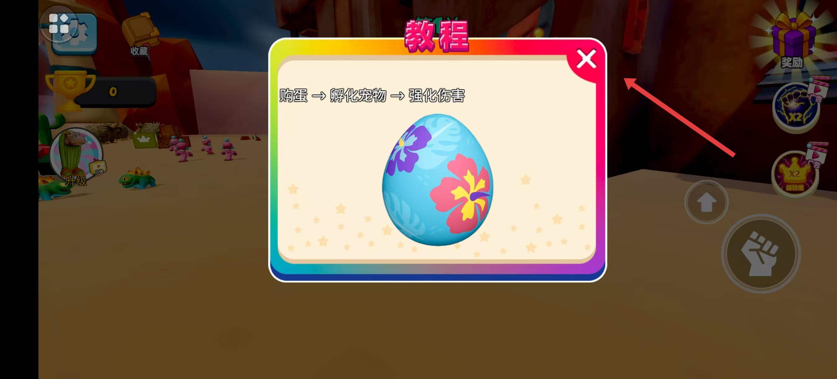 3、與蛋互動后,會彈出教程提示框,上面清晰展示了購蛋、孵化寵物、強化傷害的流程,仔細了解這些流程后,就可以關閉提示框,繼續進行后續的操作。