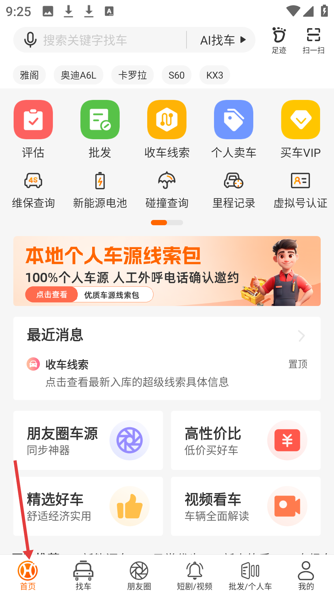 1、首頁有搜索找車AI找車功能,提供評估、批發等服務入口,還有本地個人車源線索包及最近消息、朋友圈車源等板塊。
