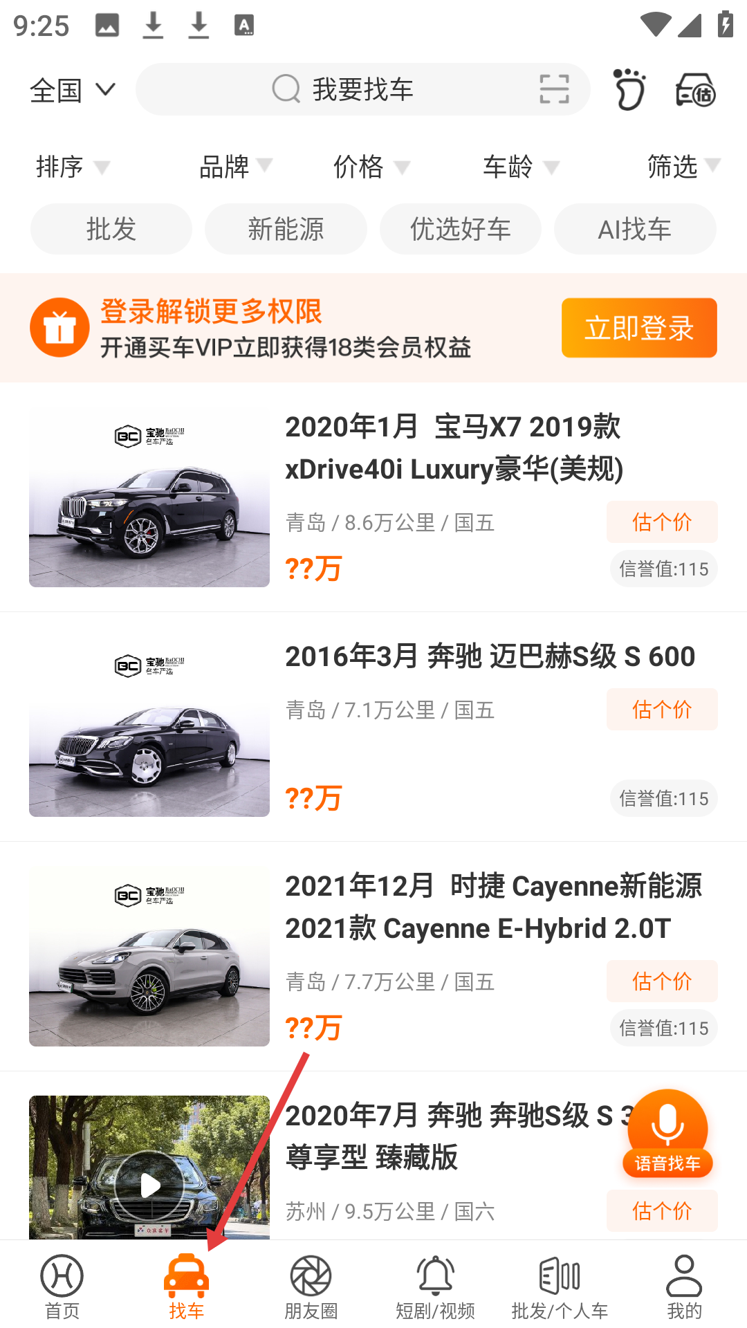 2、找車頁面可全國范圍搜車,按品牌、價格等篩選,展示寶馬X7、奔馳邁巴赫S級等車型,登錄可解鎖更多權限還能給車輛估價。