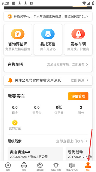 4、我的頁面有咨詢評估師、委托寄售等功能,可發布車輛,顯示買車相關現金、積分等信息,還有超級線索展示待售車輛。