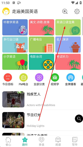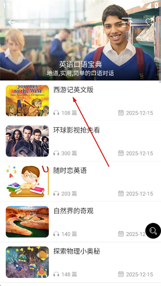 1、打開走遍美國軟件,進入主界面,找到英語口語寶典分類并點擊,進入對應的學習內容列表頁面。
