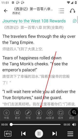 4、在章節詳細頁面查看中英對照的文本內容,可使用聽讀跟讀等功能,開展該章節的英語學習練習。