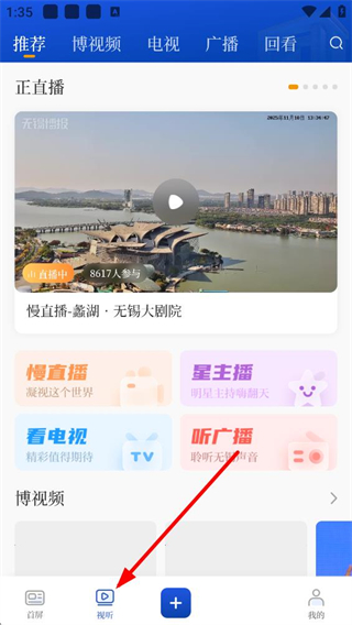 1、進入首頁,可瀏覽推薦、博視頻、電視等板塊內容,觀看慢直播、星主播等節目,參與各類互動,底部有首頁、視聽等功能入口。