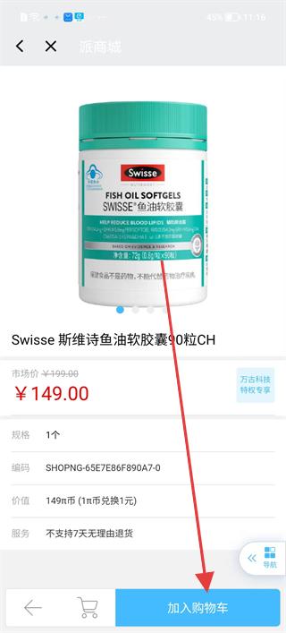 4、進入Swisse魚油膠囊商品詳情頁,查看市場價及內購價,確認商品規格等信息后,點擊加入購物車按鈕,完成商品加購。