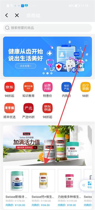 1、打開軟件進入雅鹿商城頁面,瀏覽京東知識教育等平臺入口,查看Swisse等商品推薦,點擊對應商品查看詳情信息。