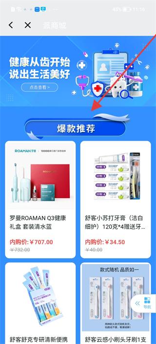 2、在商城頁面,查看爆款推薦板塊,瀏覽羅曼電動牙刷舒客牙膏等商品,了解商品的內購價及優惠活動,選擇感興趣的商品。