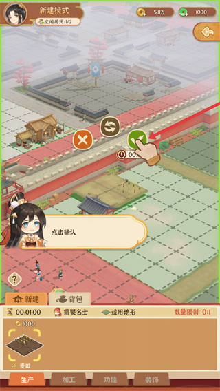 3、在新建模式可建造農田等建筑,點擊確認按鈕完成建造,布局城市建筑,提升生產能力。