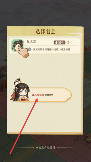 4、建造建筑時可選擇名士如趙大寶協助,減少建造時間和通寶消耗,加快建筑建設速度。