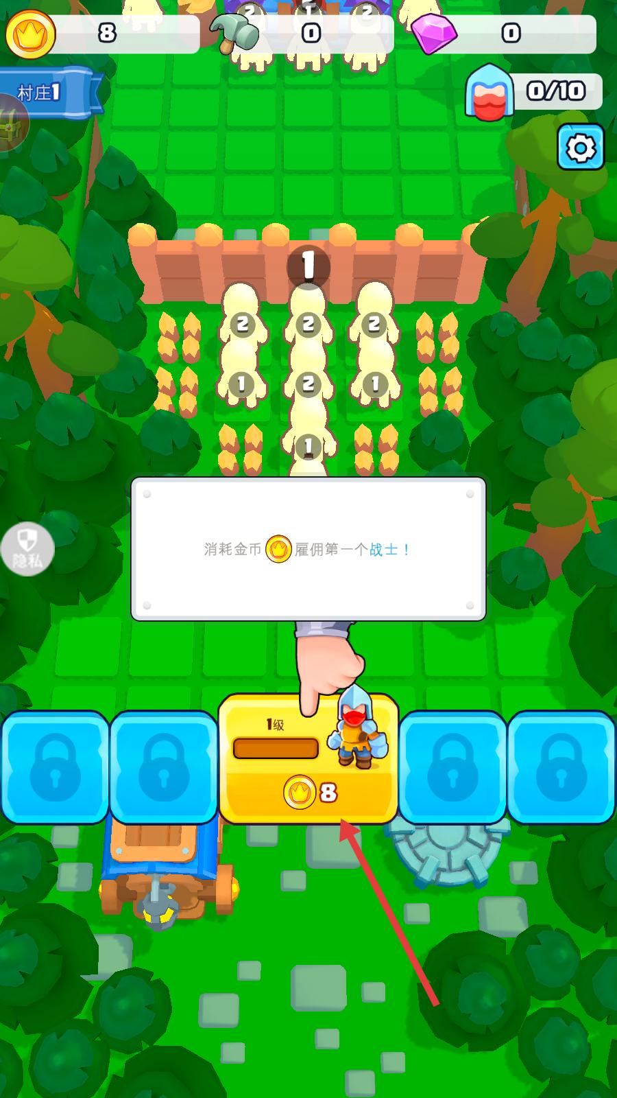 1、進入游戲界面,查看上方金幣數量,當出現雇傭戰士提示時,點擊下方顯示金幣與戰士形象的按鈕,消耗對應金幣雇傭首個戰士,助力后續戰斗。