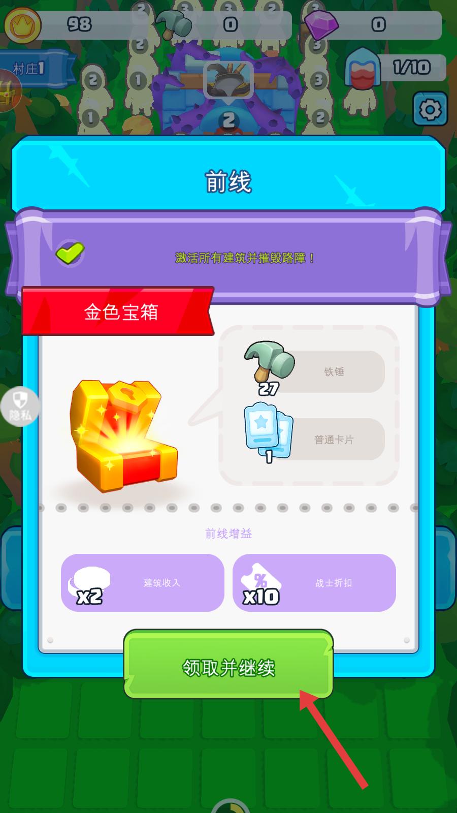 3、成功擊敗區域敵人后,會彈出前線獎勵界面,顯示金色寶箱及可獲取的鐵錘、普通卡片等獎勵,點擊綠色領取并繼續按鈕,收獲獎勵開啟新戰斗階段。