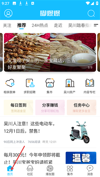 1、首頁,有關注等板塊,展示吳川美食,有相親脫單等服務入口,還有簽到等功能及本地資訊。