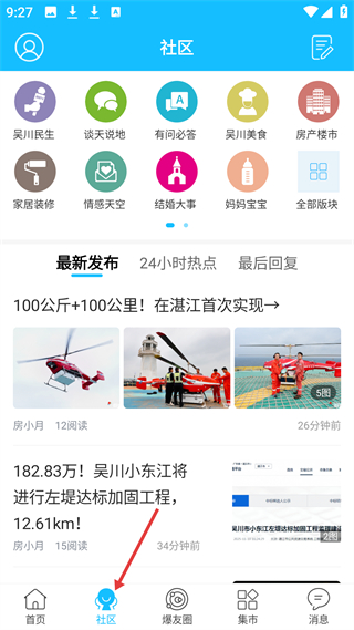 2、社區界面,含吳川民生等板塊,可看最新發布的湛江直升機、吳川小東江工程等本地資訊。