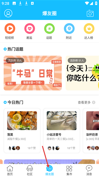 3、爆友圈界面,有短視頻等功能,有牛馬日常熱門話題,展示用戶分享的減脂午餐等內容。