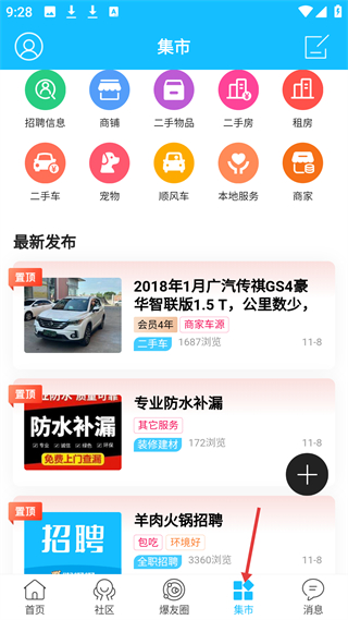 4、集市界面,提供招聘、商鋪等分類服務,展示最新發布的二手車、防水補漏、招聘等本地信息。
