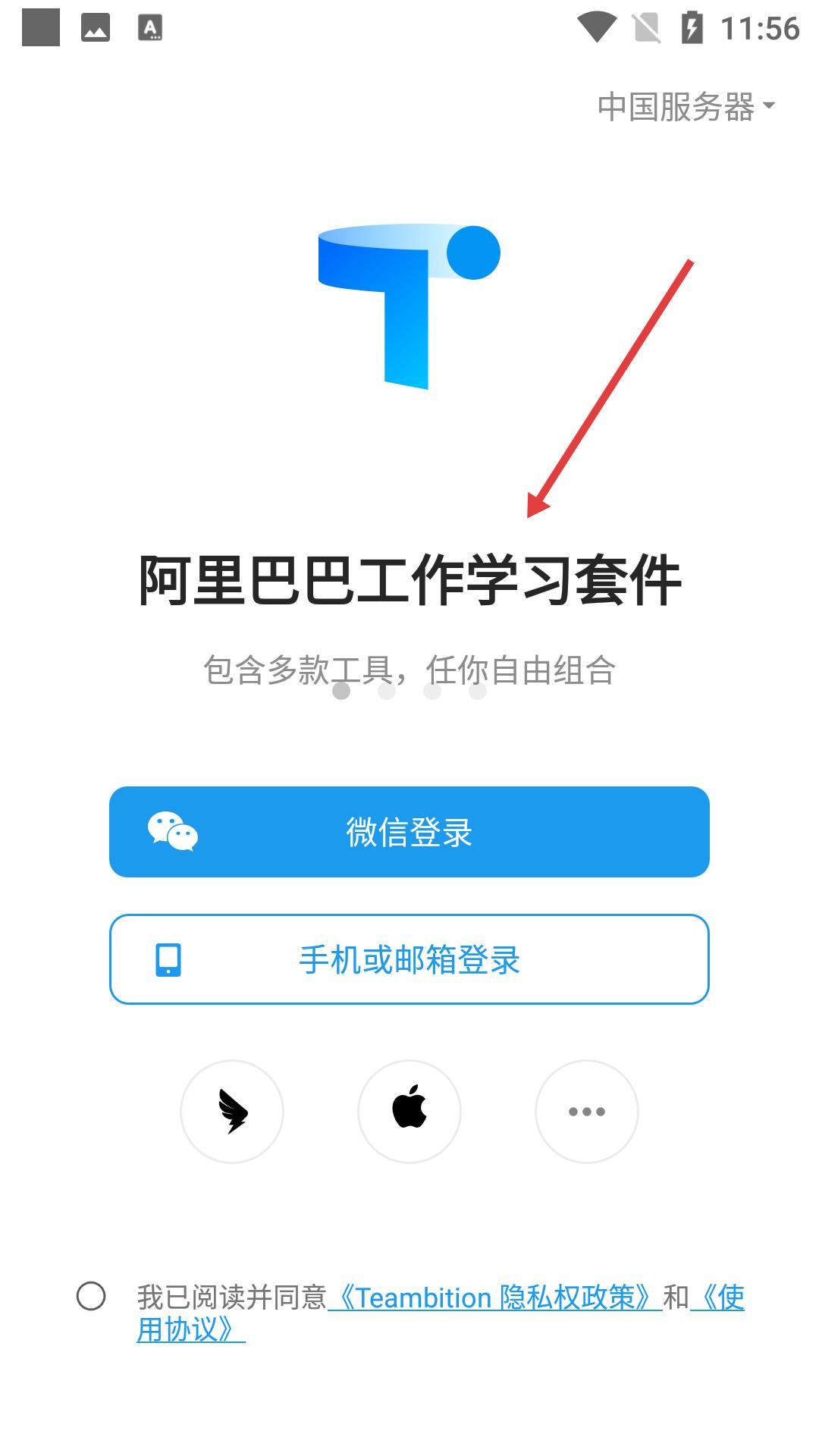 1、進入阿里巴巴工作學習套件登錄頁,可選微信或手機郵箱登錄,勾選協議后,用對應方式開啟工作學習工具使用。
