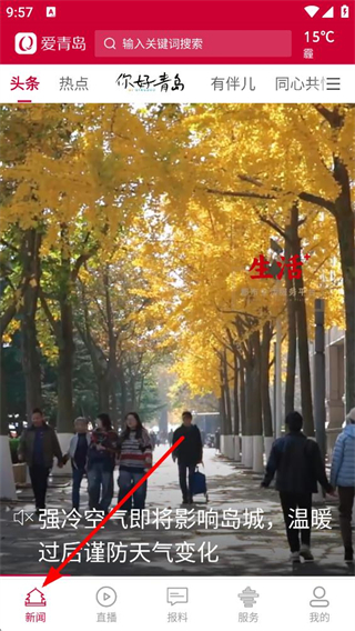 1、打開愛青島APP,進入新聞板塊,可看到頭條、熱點等分類,還有天氣和各類新聞資訊,能了解島城最新動態。