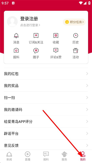 3、點擊愛青島APP我的頁面,含登錄注冊、積分任務等功能,集成消息、商城等個人服務。
