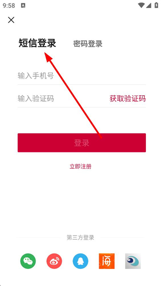 3、選擇短信登錄方式,輸入手機號,獲取并輸入驗證碼,點擊登錄即可,也可選擇第三方登錄方式,如微信、微博等。