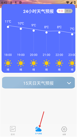 2、天氣預報板塊,展示24小時天氣預報18-23時氣溫11度,晴,有15天日天氣預報入口,提供天氣查詢服務。