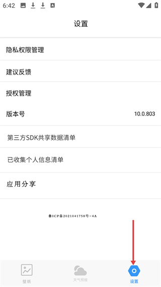 3、設置板塊,含隱私權限管理、建議反饋等選項,版本號,還有數據清單、應用分享功能,助力用戶管理設置。