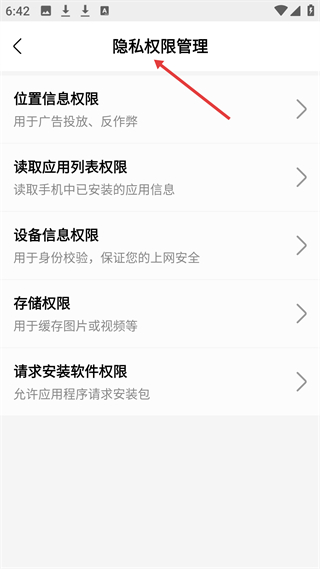 4、隱私權限管理板塊,可管理位置、應用列表、設備、存儲、安裝軟件等權限,保障用戶隱私安全。